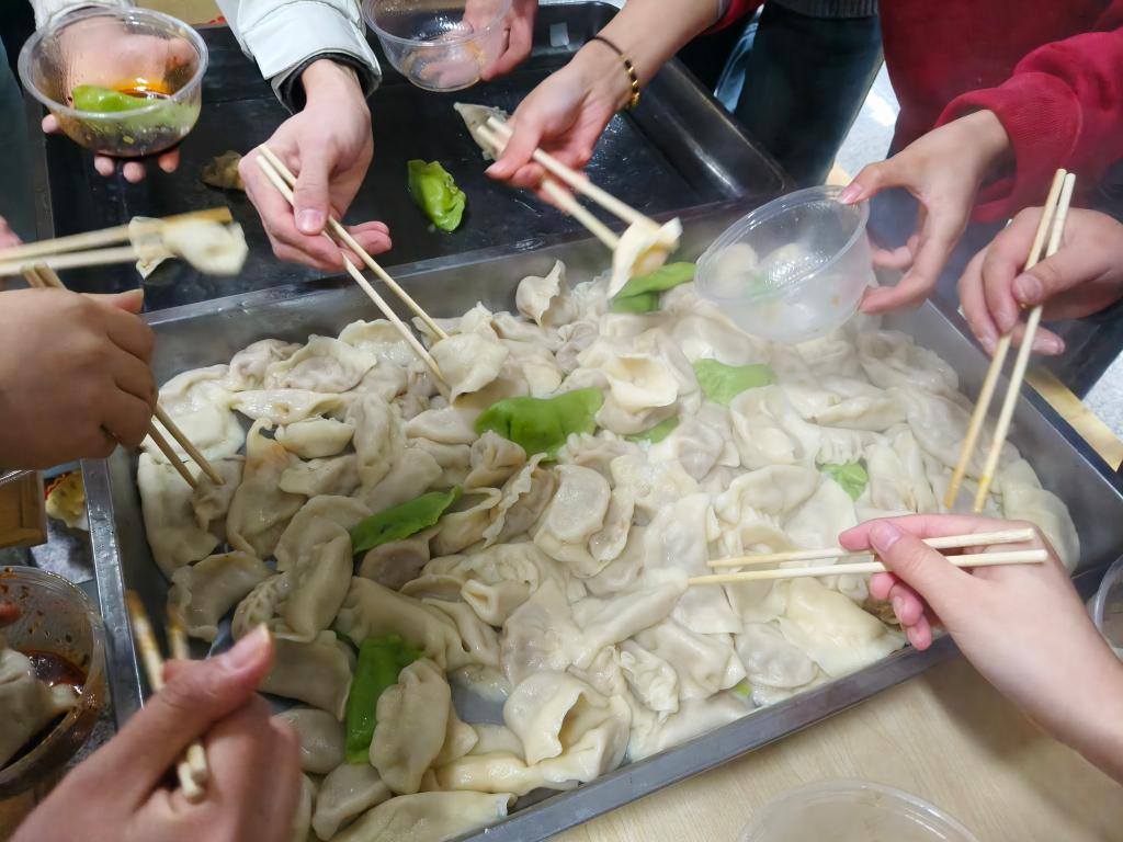 同学们分工有序,迅速投入到准备工作中。和面、擀皮、包馅,大家各司其职,手法娴熟,忙得不亦乐乎。形态各异的饺子摆满了桌面,或小巧精致,或圆润饱满,创意十足的饺子更是让人眼前一亮。随着热气腾腾的饺子出锅,香气扑鼻而来,同学们围坐在一起,品尝着亲手包制的美味,脸上洋溢着自豪与满足的笑容,欢声笑语回荡在整个二楼。